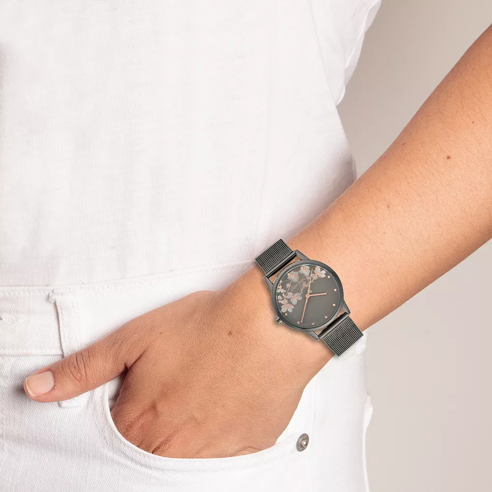 Featuring a rose gold-tone floral design on its dial, this women’s Nine West mesh bracelet watch is a chic complement to your wardrobe.